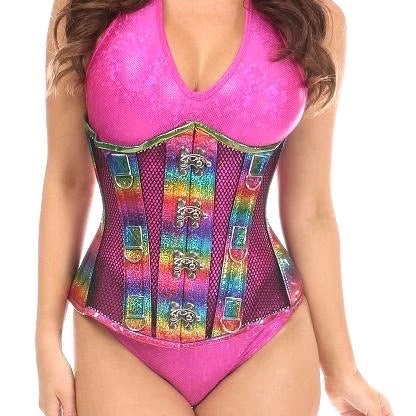 Top Drawer Rainbow Glitter PVC & Black Fishnet Steel Boned Under Bust Corset