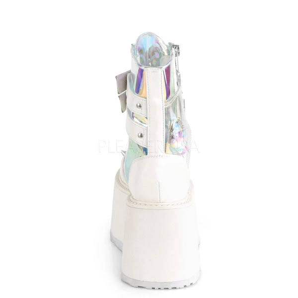 White Vegan Leather-Clear Hologram 3 1/2″ (90mm) Platform Lace-Up Ankle Front Boot w/ Double Hook N’ Loop Straps , Clear PVC Outside Panel Pocket Containing Various Charm Ornaments, and Spike Details on Vamp, Outside Metal Zip Closure |