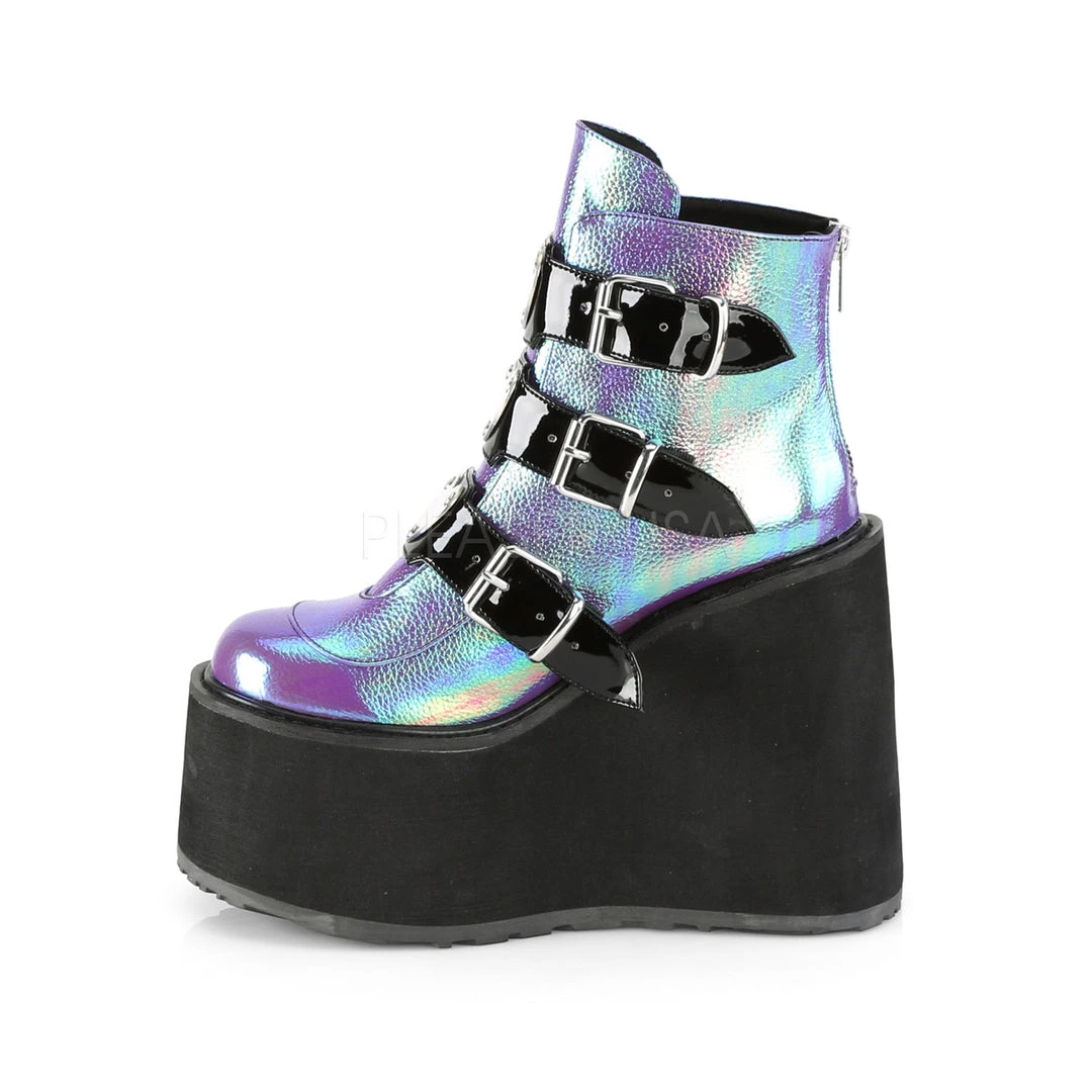 Purple Iridescent Vegan Leather, 5 1/2″ PF5 1/2″(140mm) Wedge Platform Ankle Boot Featuring 3 Buckle Straps w/ Metal Plates at Center, Back Metal Zip Closure