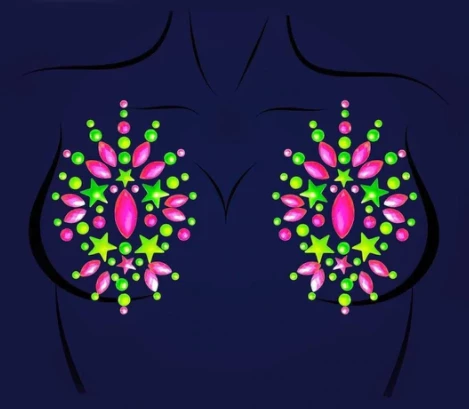 Riot neon adhesive black light jewel nipple stickers and (2) 3g body glitter packets.