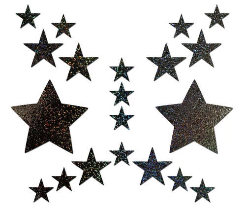 Set includes 1 pair of Black Glitter Stars with 6 Mini Stars and 10 Baby Stars Nipple & Body Pasties.