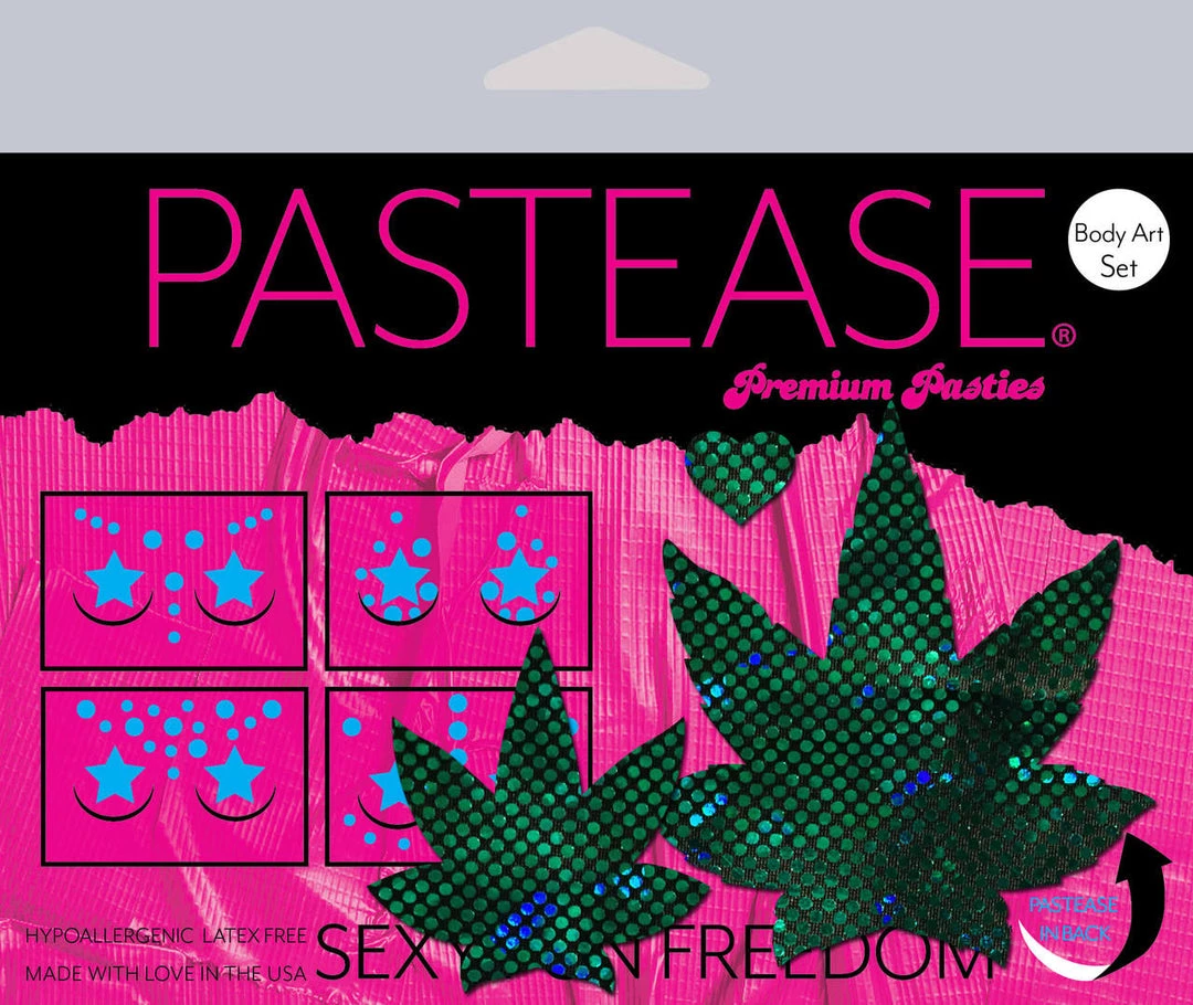 Set includes 1 pair of Disco Ball Glitter Green Indica Pot Leaf with 2 Petite Leaf and 10 Baby Hearts Nipple & Body Pasties.
