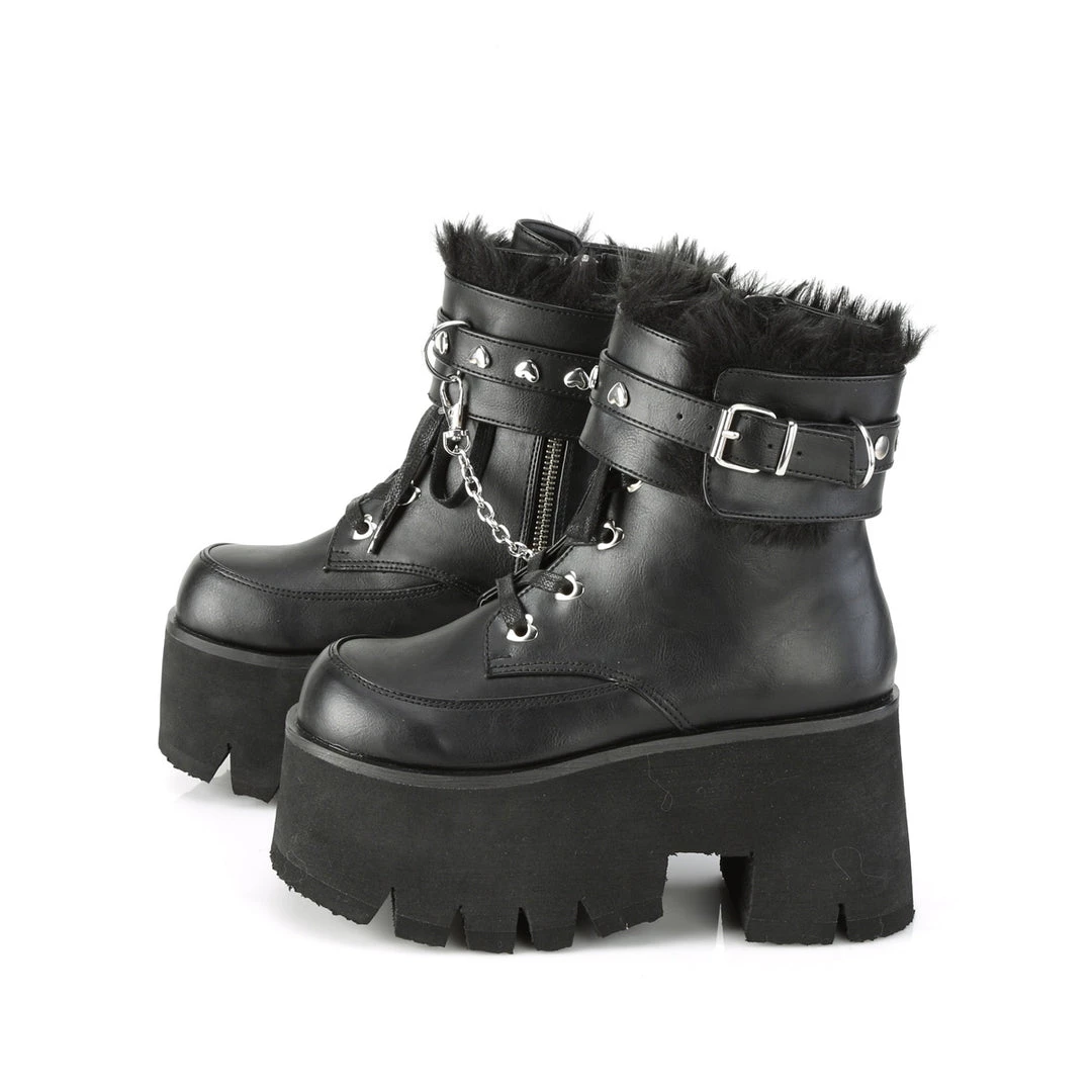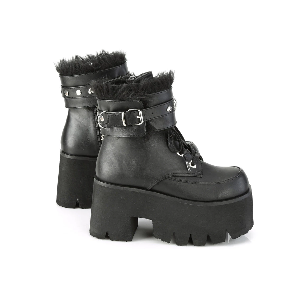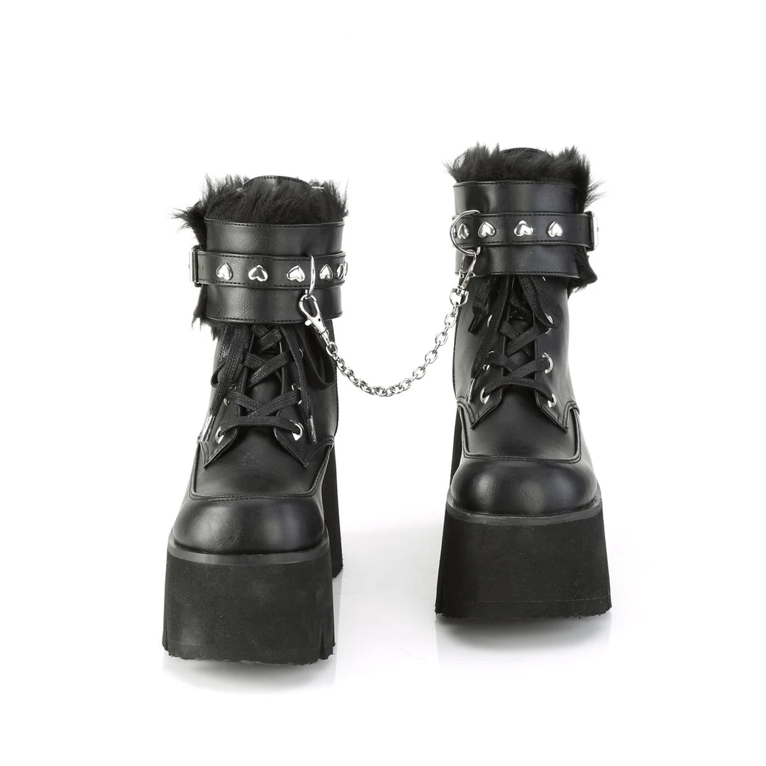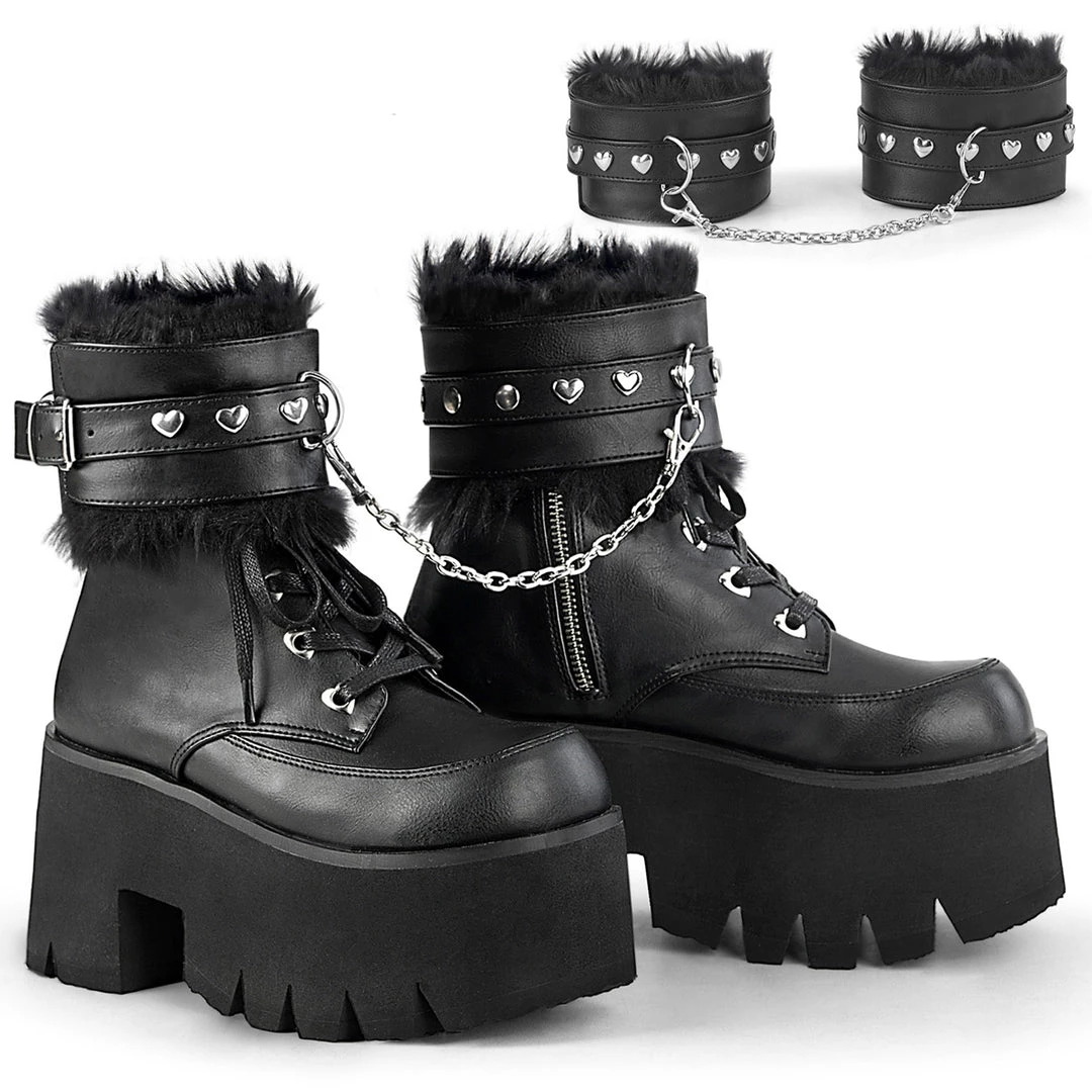 3 1/2″ (90mm) Chunky Heel, 2 1/4″ (57mm) Cut-Out Platform Heart Eyelet Lace-Up Ankle Boot Featuring Fur Lined Adjustable Removable Ankle Cuffs W/ Heart Studs, D-Ring & Chain w/ Swivel Snap Hooks Details, Metal Side Zip Closure