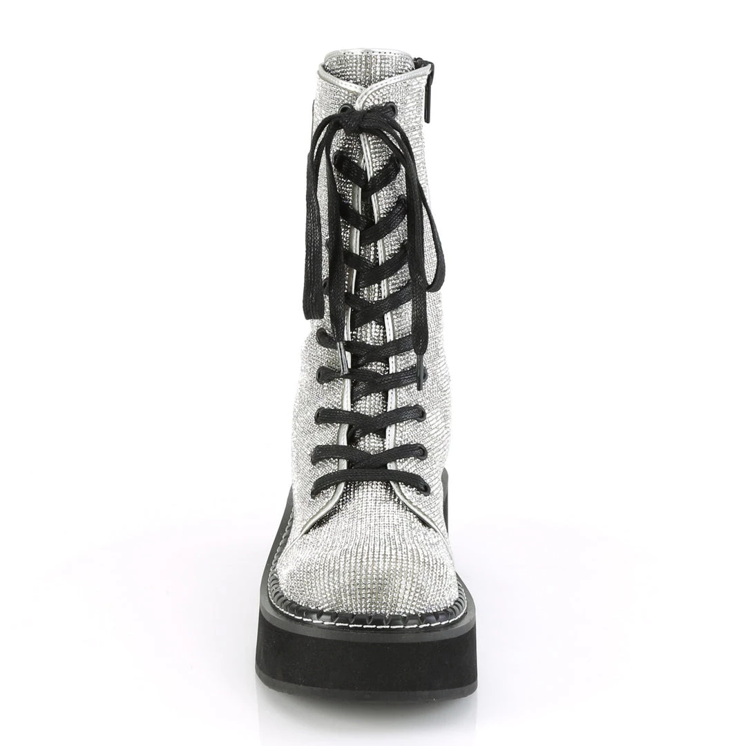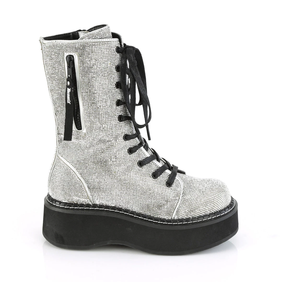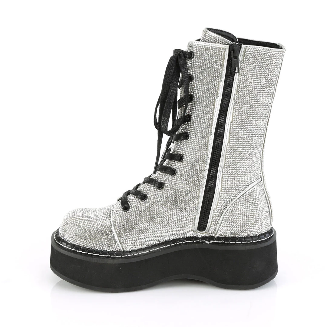 2″ Platform Mid-Calf Lace-Up Boot Featuring Rinestone Covered Upper & Outer Metal Zipper Pocket, Inside Metal Zip Closure
