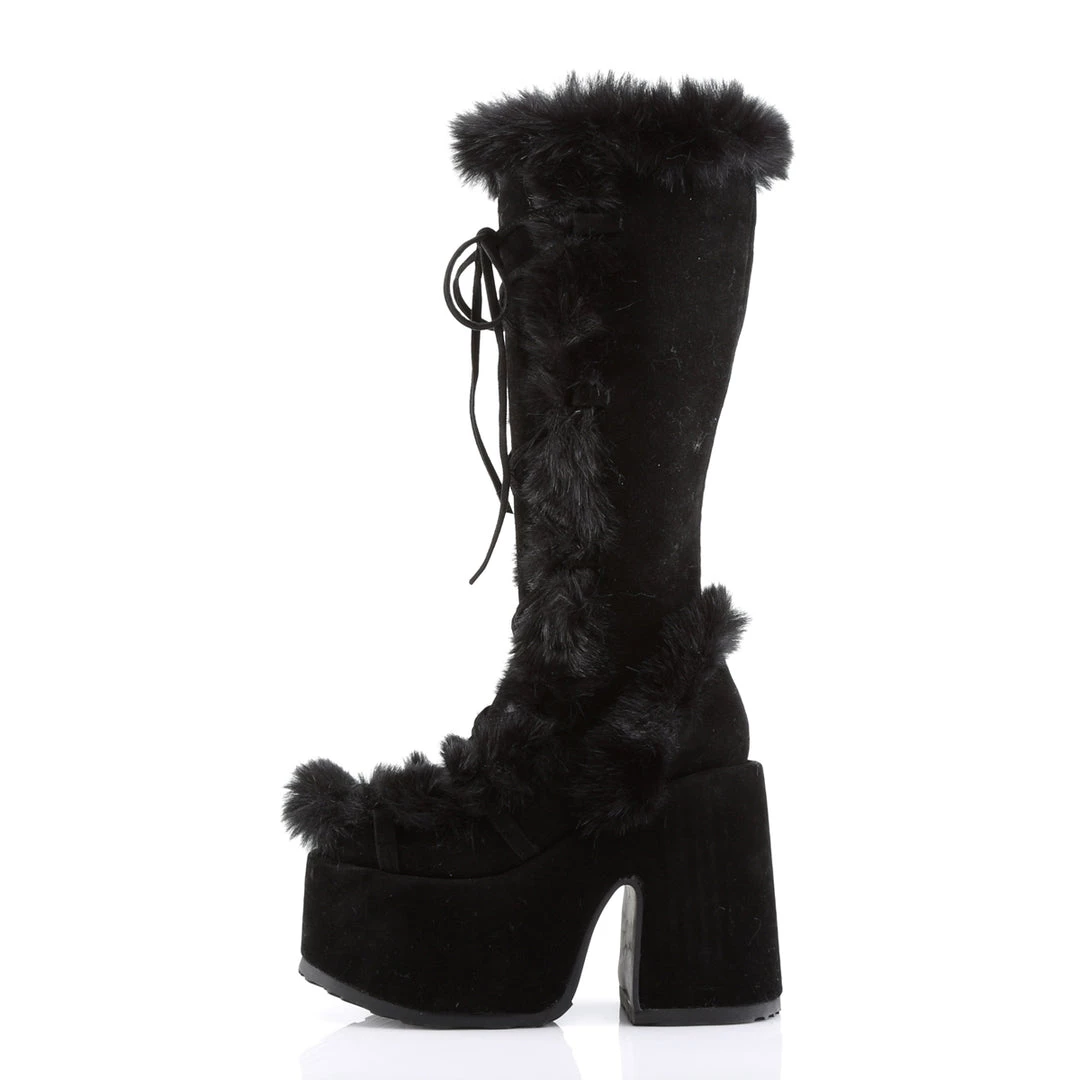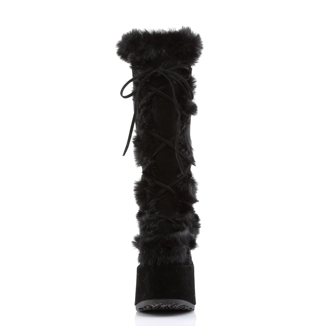 5″ (127mm) Chunky Heel, 3″ (75mm) Platform Lace-Up Knee High Boot Featuring Faux Fur Trim Detail, Full Inner Side Zip Closure.