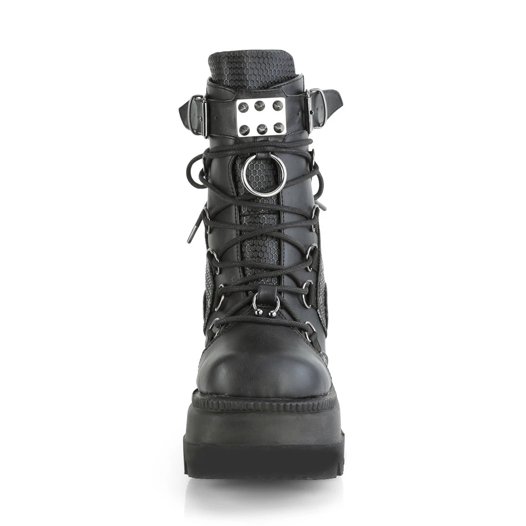4 1/2″ (114mm) Wedge Platform Lace-Up Dual Buckle Ankle Boot Featuring Studded Contrast Panels & Pewter Tone Hardware On Front Center Vamp That Includes Horseshoe Ring , Spike Studded Metal Plate and Large O-Ring, Metal Back Zip Closure