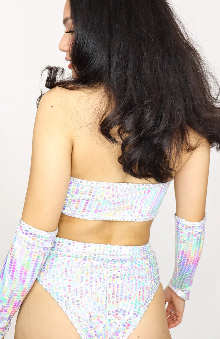 GIVE THEM A LITTLE PEEK AT THE GOODS IN OUR LIQUID MIRROR WHITE KEYHOLE TOP FROM OUR LIQUID MIRROR COLLECTION. PAIR THESE WITH THE MATCHING HIGH-WAISTED BOTTOMS AND GLOVES TO COMPLETE YOUR FIT!
