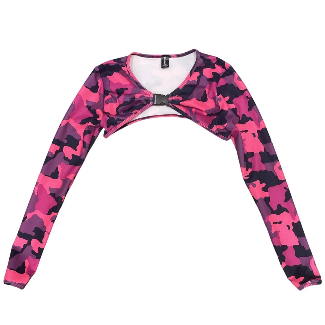 PINK WARFARE CAMO SHRUG TOP WITH BUCKLE.