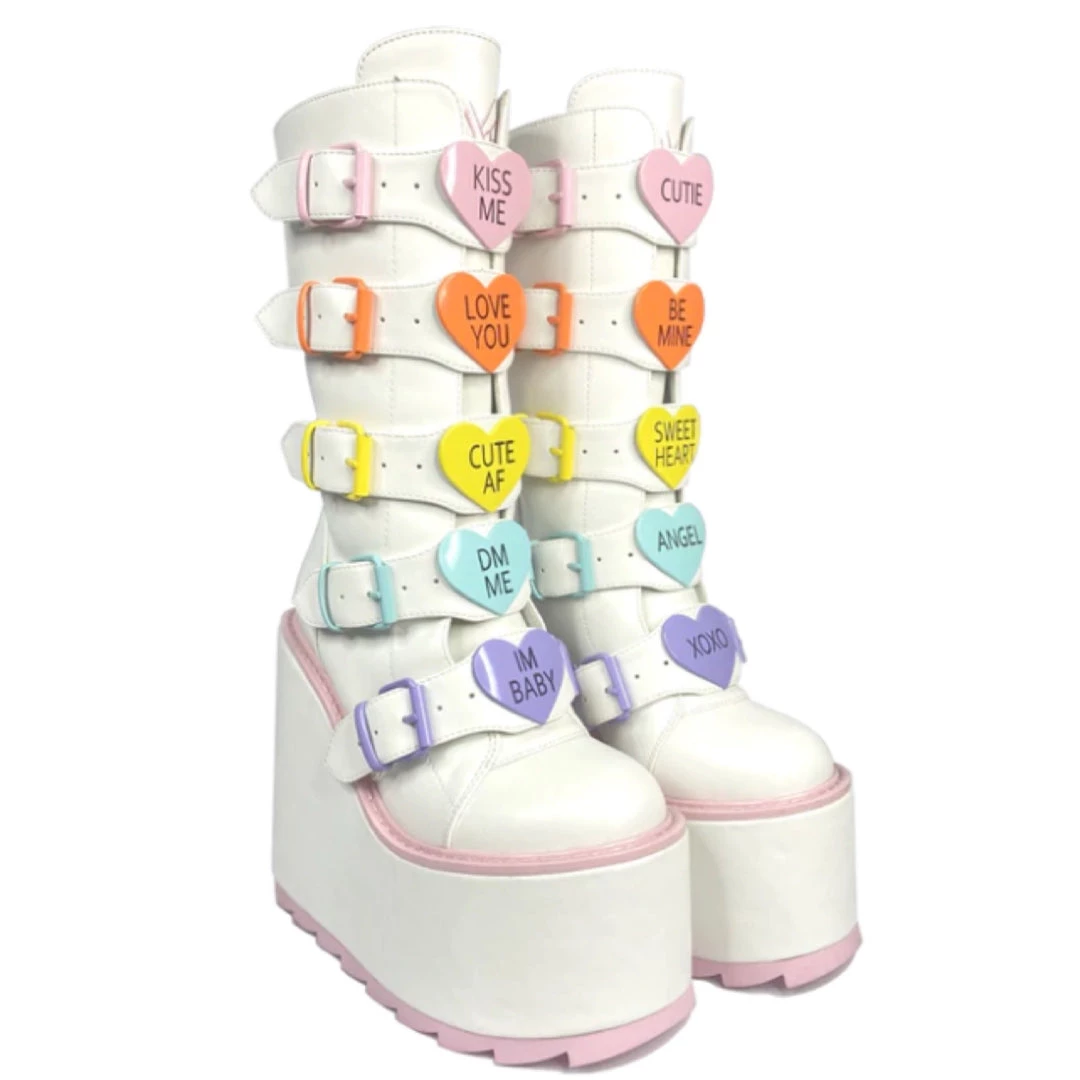These are cute on another level! Be THE valentine all year-round with these white and pink Dune’s with pastel innocence. Charm all your lovelies with a variety of cute inscriptions on candy-like, heart shaped hardware.